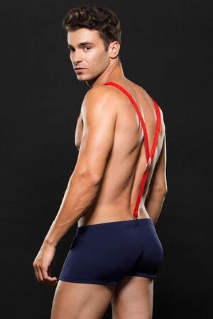 Turn up the heat in this Men’s Fireman Set that features a fitted dark blue boxer with faux pocket details, reflective stripes, and red suspenders with silver hardware and a “Y” back.