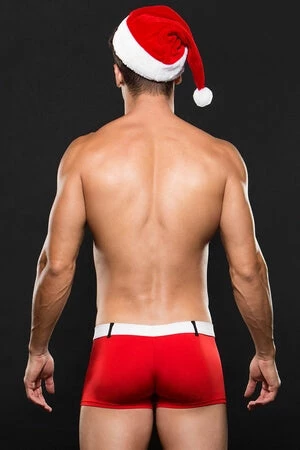 Show of your naughty holiday spirit in this Men’s Santa set that features a fitted red boxer with a white waistband, belt loops, buttons, and bell accent, and matching santa hat with pom pom detail.