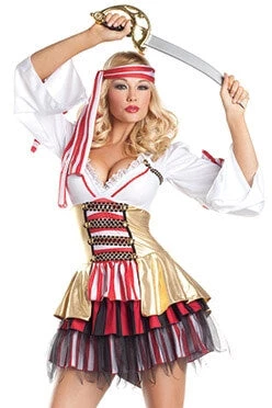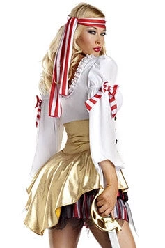 This daring “Sultry Sea Siren” costume features gold, white, red and black dress with matching striped head scarf. Sword not included.