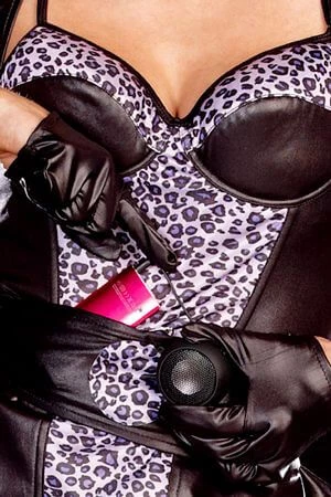 Cheetah print dress has foam underwired cups and belt with speaker and MP3 plug-in capability. Includes wig, headpiece with microphone, instruction sheet, USB cord, and rechargeable battery. (Sunglasses, gloves, thigh highs and bracelet not included) (6 piece set)