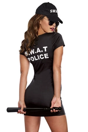Set your ground rules and start regulating tonight in this hot black dress with front zipper, “S.W.A.T.” screen print, hat and police badge.