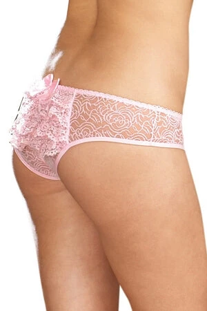 Experience uninhibited pleasure in these red hot open crotch lace booty shorts. The sexy low waist shorts feature a lace ruffle detail in back with a bow detail. Shorts are made out of sheer stretchy lace that hugs your body.