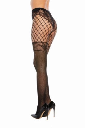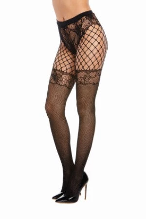 Multi-pattern fishnet and lace pantyhose. Knitted lace panty design, and fence net thigh with lace top fishnet thigh-high knitted design.