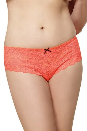 This diva coral panty features stretch lace, open crotch, cheeky boyshort with satin bow detail.