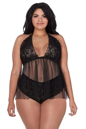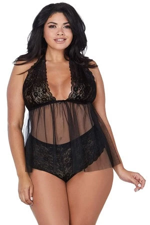 This retro lace and mesh halter babydoll features flyaway-back styling and hook & eye closure.