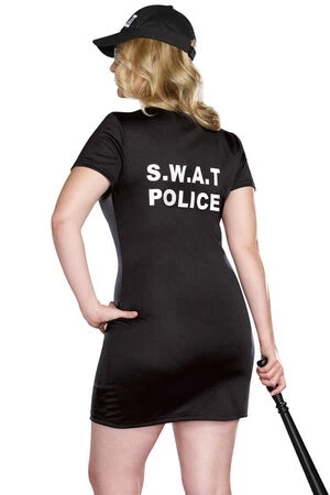Set your ground rules and start regulating tonight in this hot black dress with front zipper, “S.W.A.T.” screen print, hat and police badge.