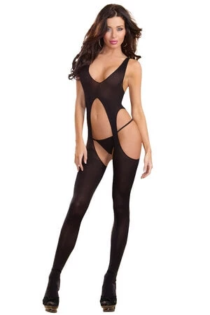 Tease your lover in this sexy suspender bodystocking. This seductively sheer tank body stocking features cut outs in the front, back and on the sides. The sultry bodystocking is made out of smooth 100% nylon fabric. Panty not included. **Sizing Note – One Size should work for you, if you normally wear XS, SM, MED, and sometimes LG.