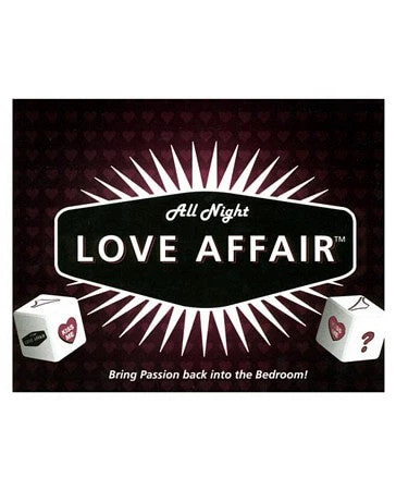 Bring passion back into the bedroom! Just take turns rolling the game die. The rolling player must draw a card from the card pile that corresponds with the picture that landed face up on the die then follow the instructions on the card. Once complete, the card is returned to the bottom of the deck. If a player rolls a “?”, he or she can choose a card from any category. Love Affair cards are off limits until the rolling player has rolled no less than 5 turns. The first player to roll a Love Affair after their 5th roll wins the game and gets to draw a card from the Love Affair pile. Game box measures 7″L x 1.625″W x 5’5″ T. When was the last time you made love all night long?