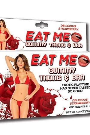 Eat Me Gummy Thong and Bra! Intimate play time just got even more deliciously fun with this strawberry edible gummy thong and bra set. Put them on and eat them off. For an edible sexy experience that neither you nor your lover will soon forget. One size fits all.