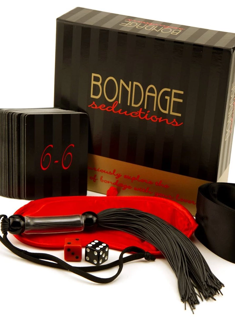 Allows you to safely explore the curious world of restraints, dominance, pleasurable pain and submissiveness. Play as a game or simply use one card for each adventure. Includes 36 Bondage Seduction cards, 2 silky ties, 2 dice, 1 blindfold mask,1 high quality rubber whip, and kit instructions.