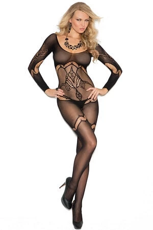 Long sleeve crochet bodystocking with floral design and open crotch. **Sizing Note – One Size should work for you, if you normally wear XS, SM, MED, and sometimes LG.