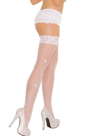 This set of sheer wedding bell thigh high stockings are the perfect compliment to any bridal lingerie set. Sweet and romantic, yet hot and spicy. **Sizing Note – One Size should work for you, if you normally wear XS, SM, MED, and sometimes LG.