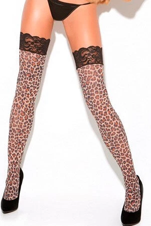 Unleash some primal desire in these leopard print thigh highs with lace tops.