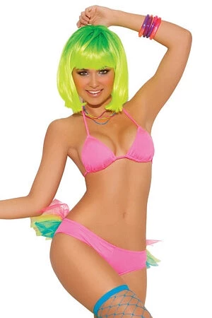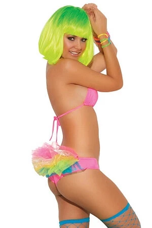 Triangle-cut string bra set with rainbow tutu along panty back. **Sizing Note – One Size should work for you, if you normally wear XS, SM, MED, and sometimes LG.