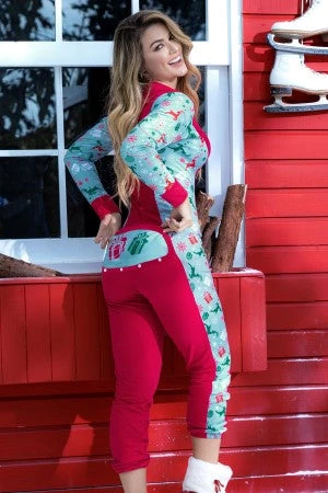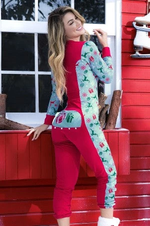 A long onesie for cold holiday nights is just what you need. Contrast the red with a holiday print and a front closure that fastens. Turn around and surprise with this removable cover.
