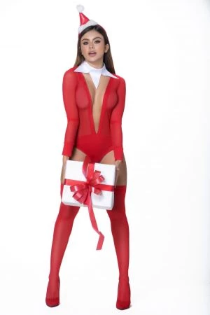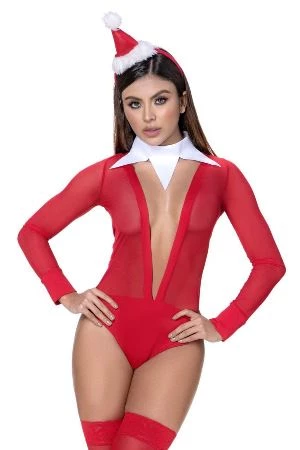This sexy elf costume from Mapale includes a long-sleeve bodysuit in sheer mesh, laser cut collar and headband.