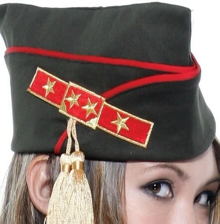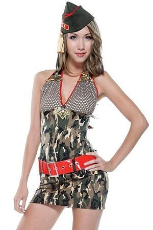 Flirty military inspired costume set with halter neck camouflage dress with military patches, matching hat and red belt.