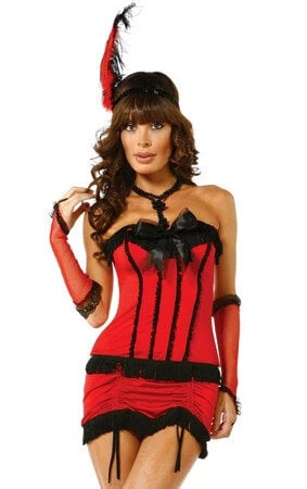 Firty Fringe costume includes strapless top with fringe trim and bow detail, matching skirt with ruched drawstring front, gloves and headpiece.