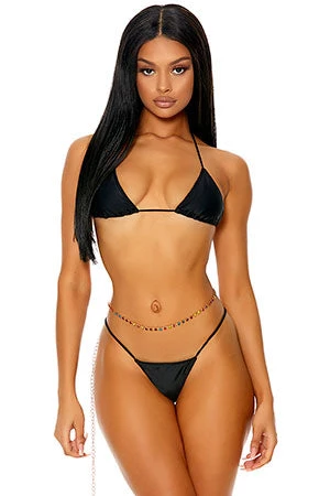 Two-piece classic triangle bikini features halter top paired with matching string side bikini bottoms and ornamental colorful belly chain.