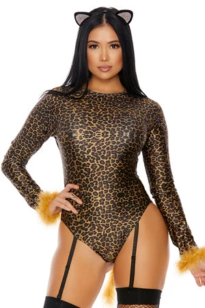 Slide into this sexy leopard print bodysuit and feel like a real cat with marabou fur trim. Attached garters make this sexy look even sexier when paired with the matching ear headband.
