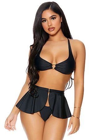 Three-piece set includes top with strappy back tie and gold metal ring detail paired with matching bottom and peplum skirt.