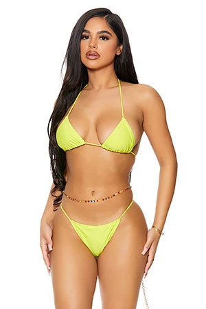 Two-piece classic triangle bikini features halter top paired with matching string side bikini bottoms and ornamental colorful belly chain.