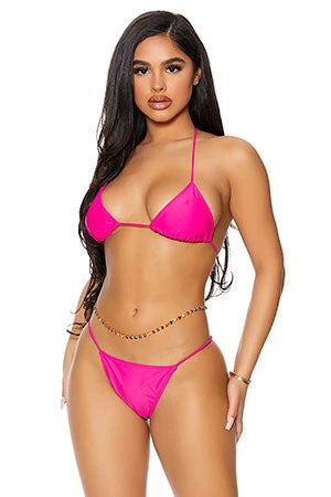Two-piece classic triangle bikini features halter top paired with matching string side bikini bottoms and ornamental colorful belly chain.