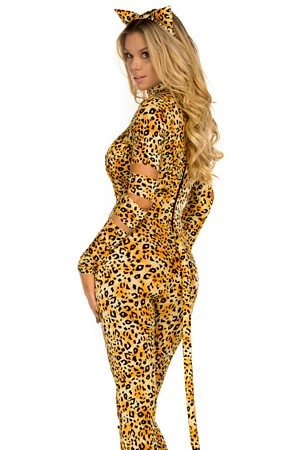 Sinful Kitty includes an animal print catsuit with slash detail and matching tail and ears.