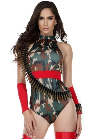 4pc. Soldier costume set includes camo print mock neck romper with zipfront closure and matching accessories.