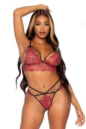 Set the mood in the ultra-sexy rhinestone lace bralette and g-string lingerie set by Leg Avenue. A seductive dream, this two-piece features a scalloped lace rhinestone strappy bralette with adjustable straps and matching cut-out strappy g-string. Perfect for steamy nights in the bedroom or to layer your sexy lingerie with your favorite night out look.