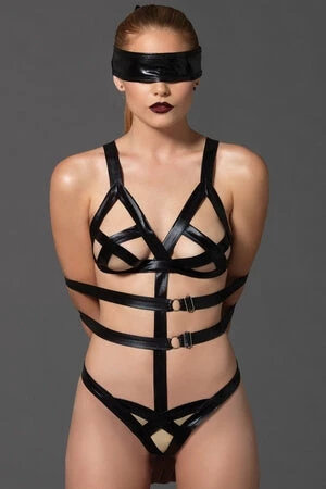 Surrender to pleasure in this strappy bondage teddy! Three piece cage teddy features adjustable waist straps with O-ring accents, criss-cross open cups, hook-n-eye back closure, open crotch, g-string back, eye mask with tie closure, and wrist restraints. **Sizing Note – One Size should work for you, if you normally wear XS, SM, MED, and sometimes LG.