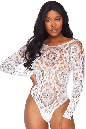 This dreamy white crochet lace teddy features long sleeves, cutout back detail and snap crotch.