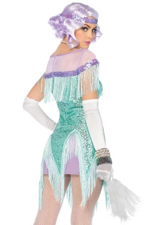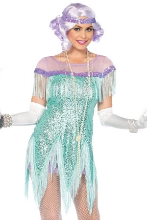 Foxtrot Flirt Costume includes a fringe trimmed sequin dress with zig zag hem and matching sequin headband.