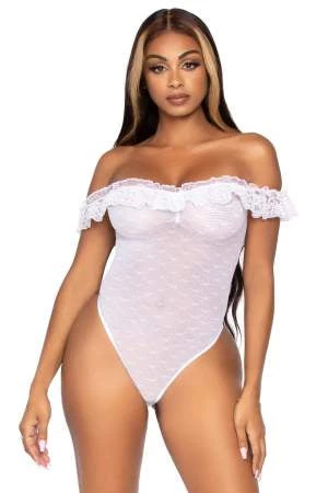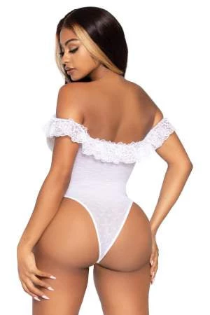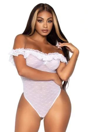 The lace ruffle lingerie teddy by Leg Avenue is a romantic dream. The flirty lace ruffle off the shoulder women’s bodysuit features a woven point d’esprit detail and snap crotch for easy wear. This sexy lingerie piece is perfect for the bedroom or paired with jeans.