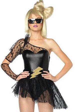 Lightning Rocker Costume Set Includes: Asymmetrical bodysuit with lace sleeve and skirt, lightening belt, and gauntlet glove.