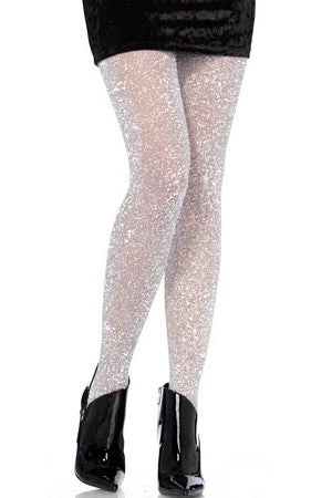 Silver lurex tights with shiny silver flakes all throughout. **Sizing Note – One Size should work for you, if you normally wear XS, SM, MED, and sometimes LG.