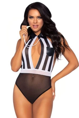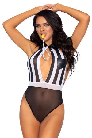 Call the penalty for lack of foreplay in the 2 PC Bedroom Ref roleplay lingerie by Leg Avenue. This fun bedroom costume features a striped crotchless teddy with keyhole front, sexy bare back, and open crotch, with the mandatory ref whistle.