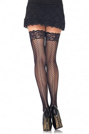 Features micro fishnet thigh highs with lace tops and diamond back seam detail. Pairs well with any black intimate wear. **Sizing Note – One Size should work for you, if you normally wear XS, SM, MED, and sometimes LG.