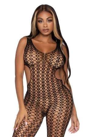 Accentuate your curves with this stunning lattice net bodystocking by Leg Avenue, featuring a tank top design with open net cups, sexy waist cut-out, and footless leg (panty not included).