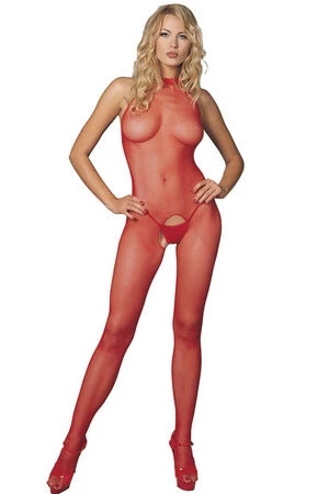 Flirty seamless fishnet halter bodystocking features a halter neckline and open crotch. Available in red or black.