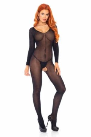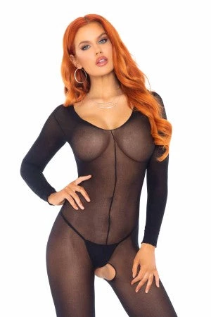 Sultry sensation! This sexy sheer long sleeved scoop neck bodystocking is an absolute must have. This flirty ensemble features a flattering scoop neck, long sleeves, full footed legs and crotchless center seam bodice. Durably made from soft and stretchy nylon mesh. Available in black or nude.