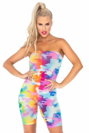 Stand out while blending in with this cute rainbow camo romper by Leg Avenue. Perfect as a rave outfit or bikini coverup, this mesh bodysuit features a strapless design with fashionable biker short legs and cute camo print. Throw a denim jacket over it or layer it with a fanny pack and sunnies, this sheer bodysuit is sure to make you stand out.