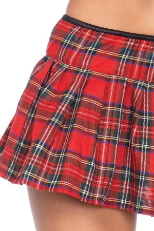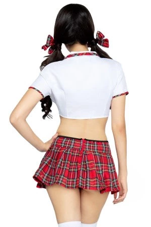 Get into a naughty prep school girl character with the four-piece Miss. Prep School costume. It includes a short skirt in a classic red plaid pattern, and matching hair bows and neck scarf, as well as a cropped white top with plaid trim.