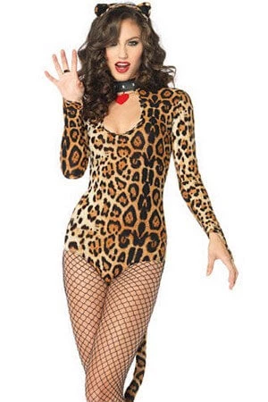 Wicked Wildcat Costume Set Includes: Keyhole teddy with tail and gauntlet sleeve, attached faux rhinestone collar with heart tag, and matching ear headband.