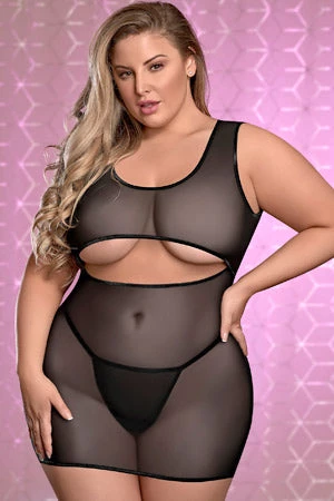 A slip on style dress featuring non-restrictive design, an underboob cutout in the front, a cutout open back, and a matching crotchless G-string.Â