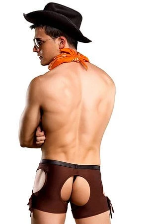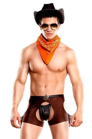 Giddy up cowboy! This costume comes with open crotch brown spandex shorts with side cutout and sheriffs badge at front center and bandana.