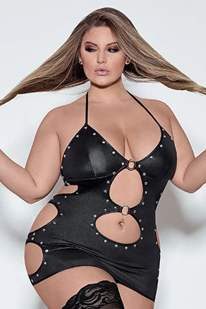 A dress featuring keyhole cutouts, a functional zipper back, and a matching g-string. Distinctive leather look fabric featuring four way stretch and nickel plated studs.
