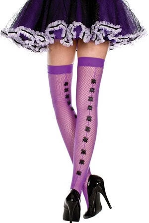 Sexy purple fishnet thigh high which features a spider design backseam. **Sizing Note – One Size should work for you, if you normally wear XS, SM, MED, and sometimes LG.