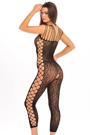 Tear into the lead with your animalistic tendencies. Leopard lace body stocking with wide gauge net sides and super strappy halter neck. Transparent, so get ready for over-the-top sex appeal. Great for layering, too. Rrrawr! G-string not included.