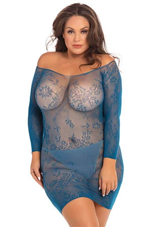 Stop and smell the roses in our simple, stretchy, long-sleeve floral lace off-shoulder mini dress. This transparent lace shows off your curves and everything underneath. Ideal for in-your-face sex appeal, or more subtle layering. G-string not included.